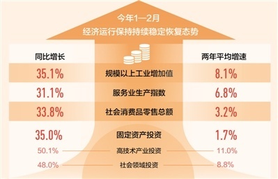 今年1—2月,我国主要经济指标同比呈现大幅增长。从去年和今年两年平均同比增速来看,经济总体上处于恢复进程中,保持了去年以来持续稳定恢复的态势。