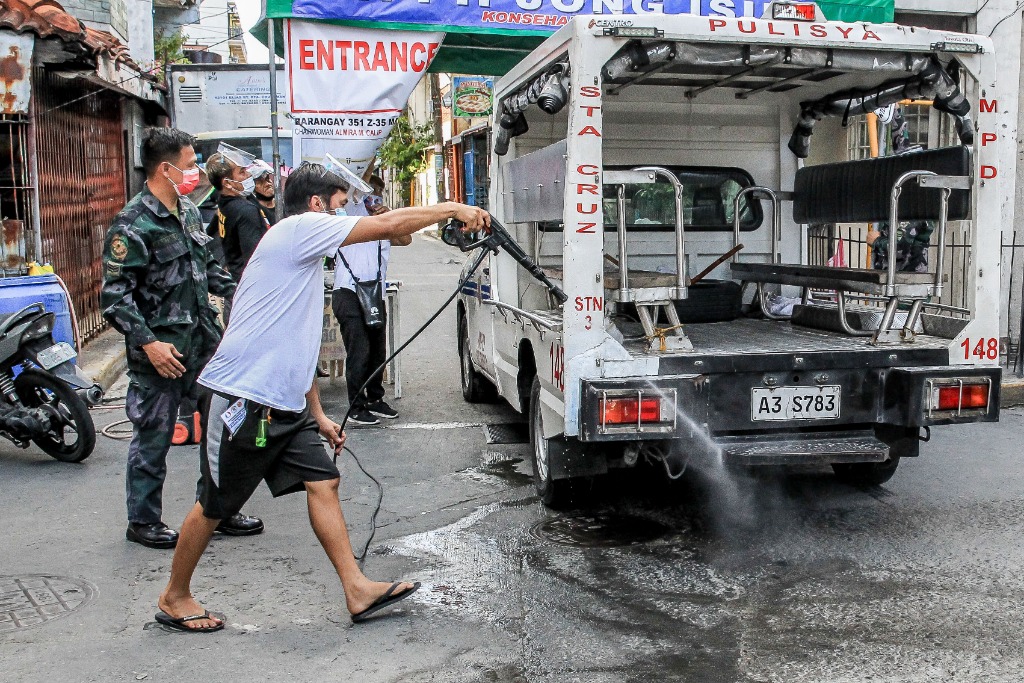 3月11日,工作人员在菲律宾马尼拉一处村口的检查站为通过的警车消毒。新华社发