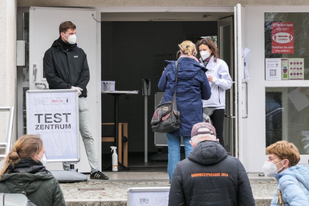 3月12日,在德国首都柏林,人们站在一家新冠病毒检测中心的入口前。新华社发