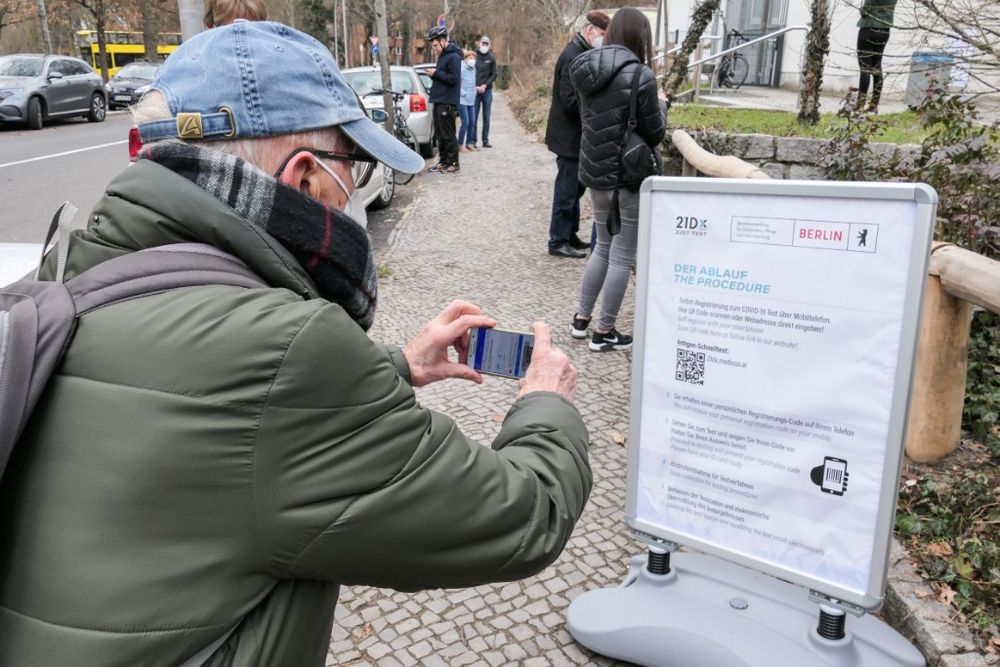 3月12日,在德国首都柏林,一名男子扫描二维码注册新冠病毒检测。新华社发