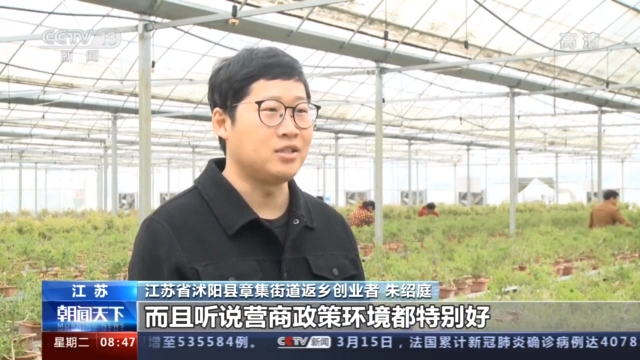 江苏省沭阳县章集街道返乡创业者 朱绍庭:苗木资源特别丰富,而且听说营商政策环境都特别好,所以当时我就下定决心回家创业。