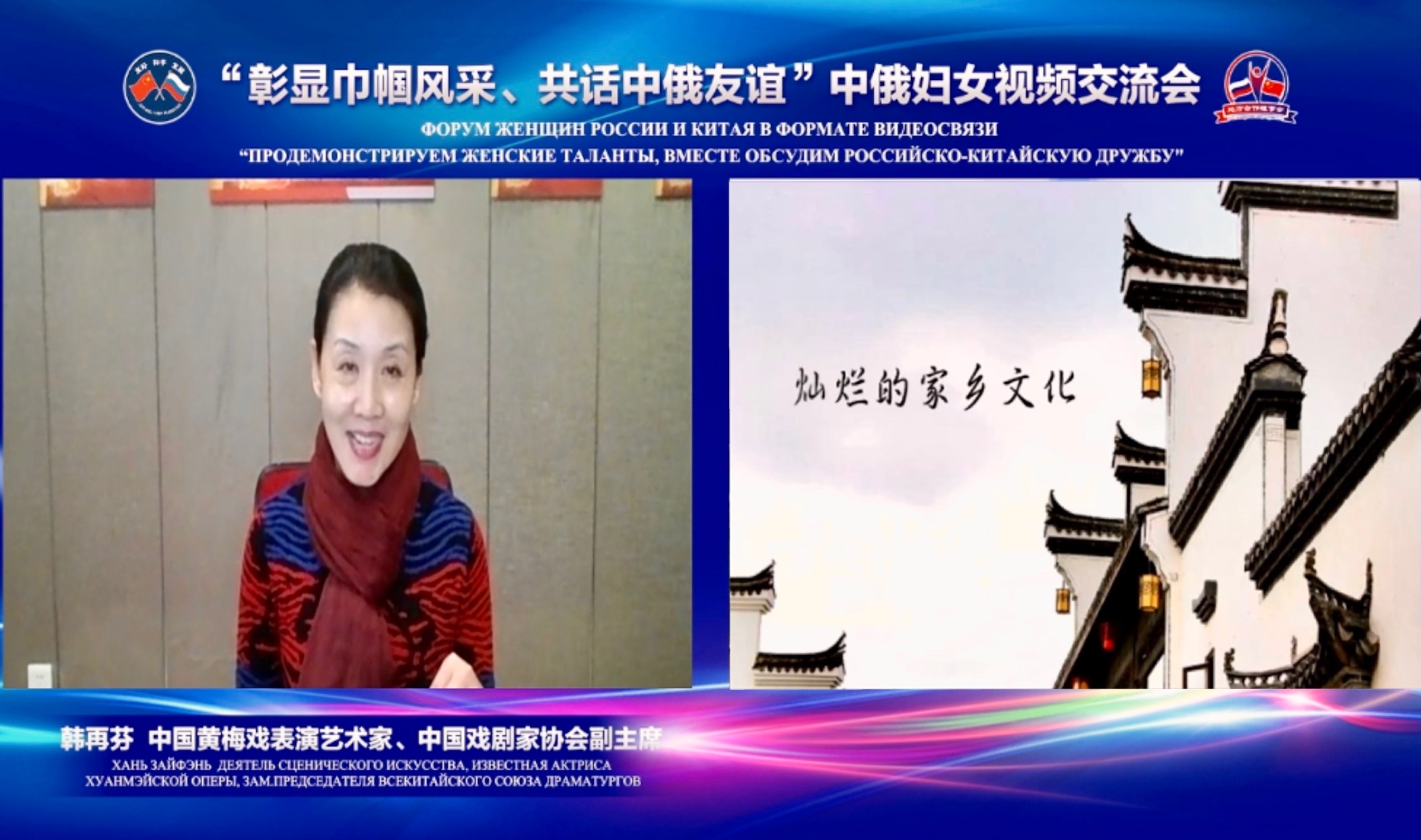 中国黄梅戏演员韩再芬在“彰显巾帼风采、共话中俄友谊”中俄妇女视频交流会上发言。(视频截图)