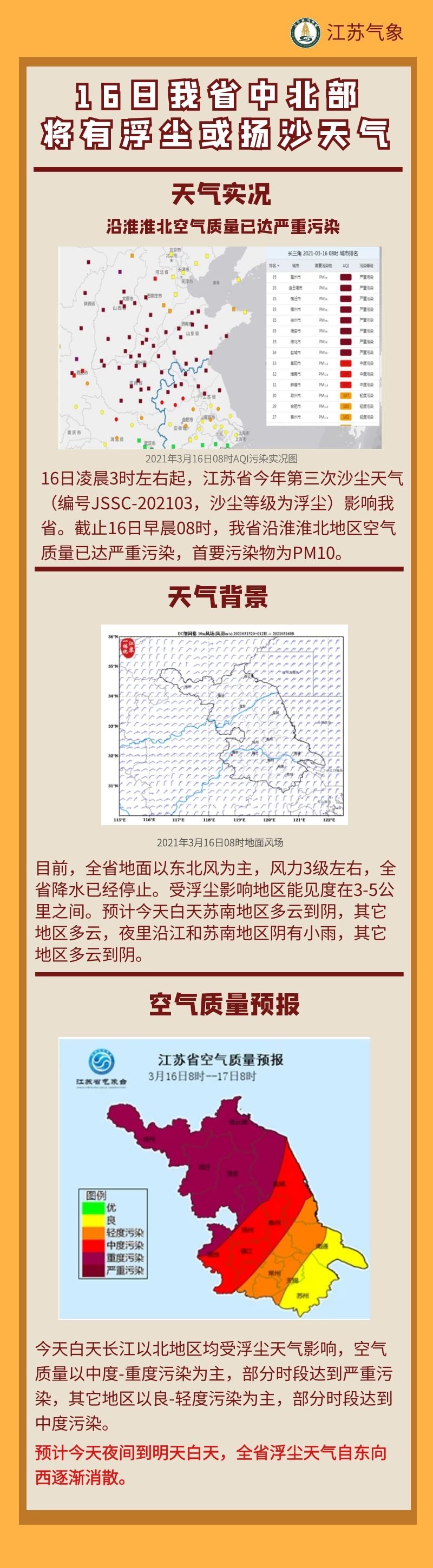 今天(16日)白天长江以北地区均受浮尘天气影响,空气质量以中度-重度污染为主,部分时段达到严重污染,其他地区以良-轻度污染为主,部分时段达到中度污染。预计今天夜间到明天白天,江苏省浮尘天气自东向西逐渐消散。