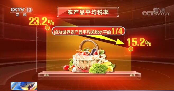 入世以来,中国关税总水平由2001年的15.3%大幅降至7.5%以下 。其中,工业品平均税率由14.8%降至7.8% ;农产品平均税率由23.2%降至15.2% ,约为世界农产品平均关税水平的1/4,接近发达国家、发达市场对外开放水平。
