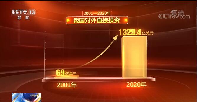 与此同时,对外投资也实现跨越式发展。2001年,我国对外直接投资只有69亿美元,而2020年达到了1329.4亿美元。对外直接投资年度流量全球排名从加入世贸组织之初的第26位上升至2019年第2位。
