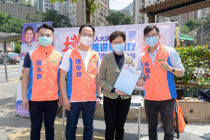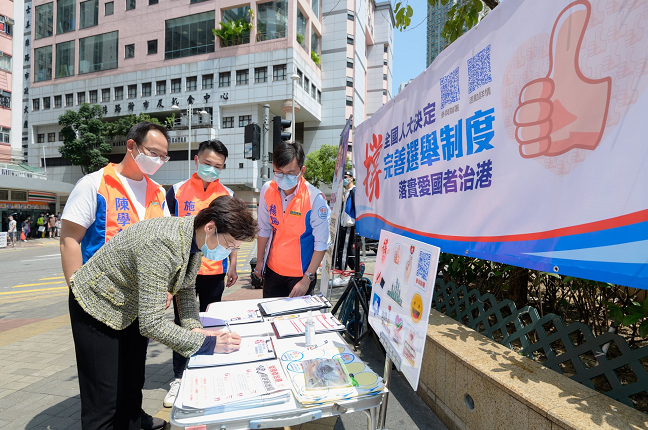 连日来,香港各界“撑全国人大决定 完善选举制度”连线在全港各区摆设街站,向市民宣讲解读完善选举制度的好处和必要性,并收集市民支持全国人大决定的签名。香港特区行政长官林郑月娥15日前往位于香港坚尼地城地铁站的街站签名,坚决支持落实“爱国者治港”原则,并为街站工作人员加油鼓劲。