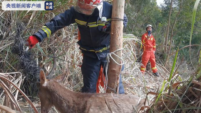 3月12日12时许,福建平潭北厝镇先建村附近有一只梅花鹿被困农田外围防护网,平潭消防救援支队接到报警后迅速派出指战员前往救援。