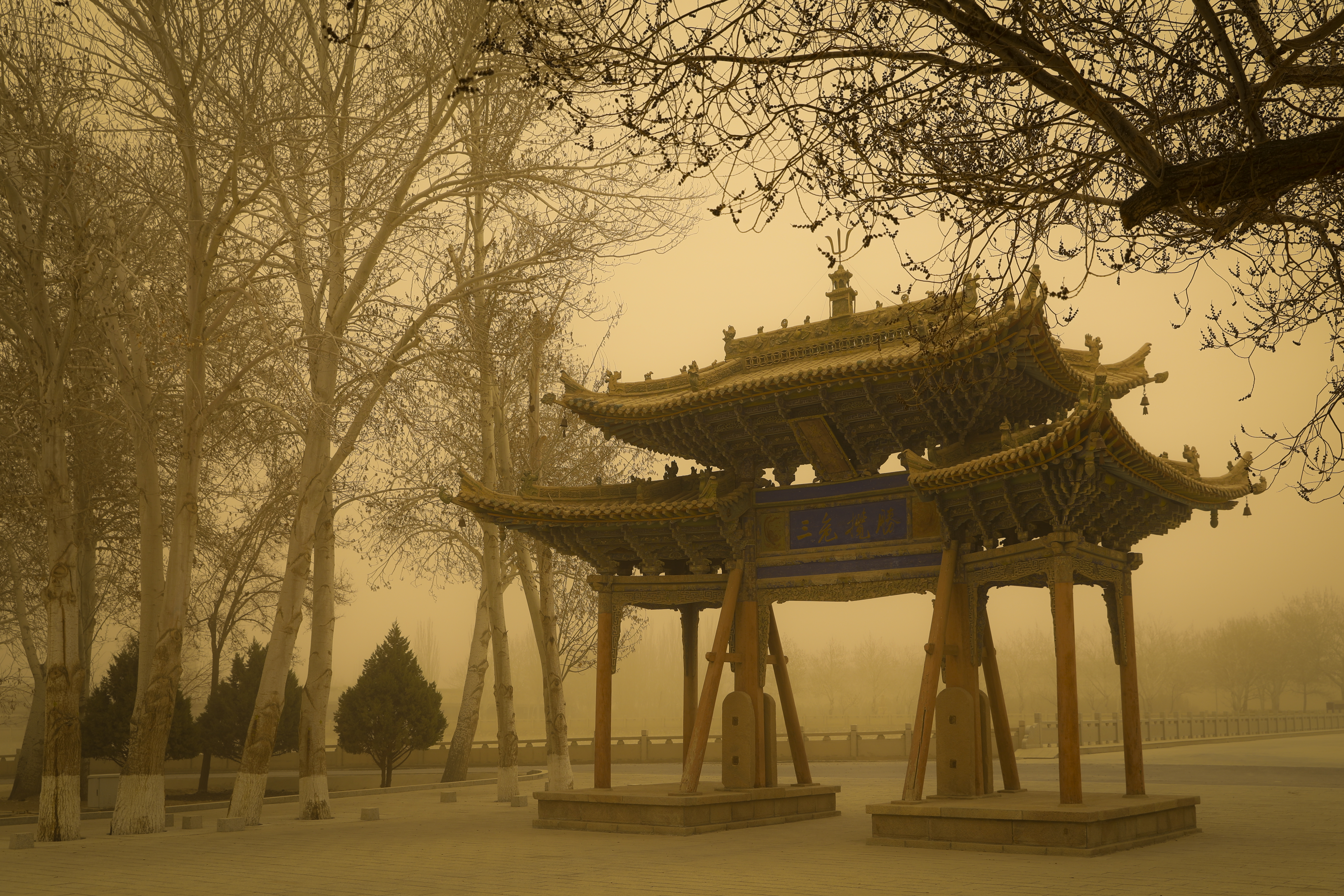 15日,风沙中的莫高窟大牌坊。王嘉奇 摄