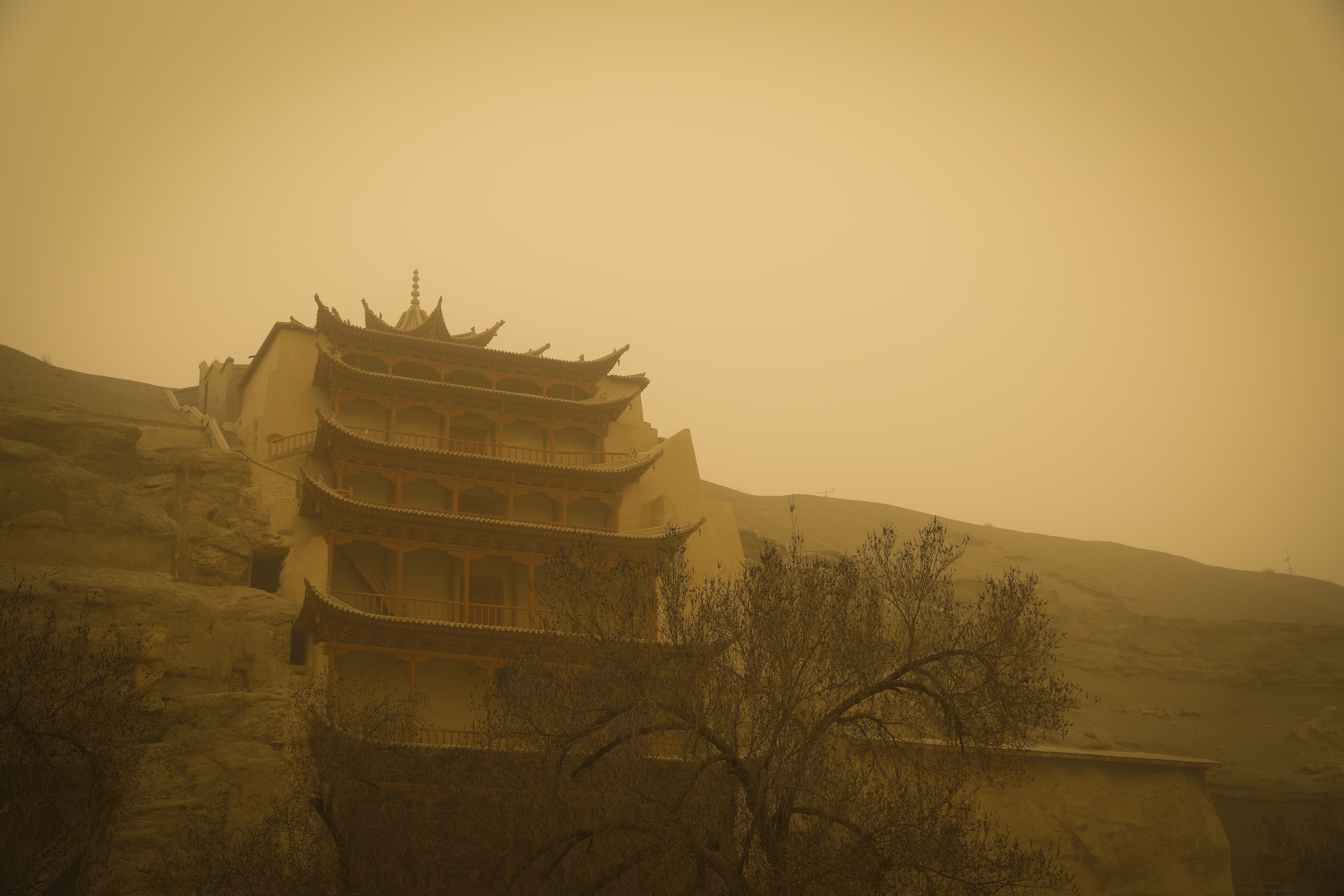 15日,黄沙笼罩的莫高窟九层楼。王嘉奇 摄