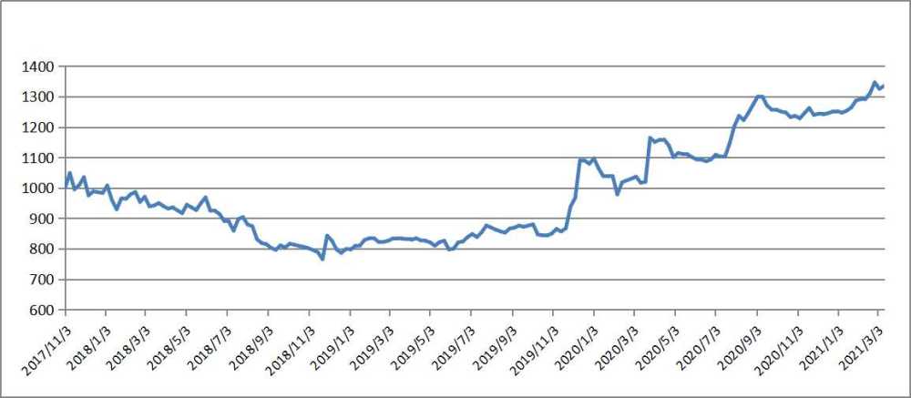 3月12日,指数报1334.69点,较上期(2021.3.1-3.7下同)上涨9.53点,涨幅0.72%,与基期相比上涨334.69点,涨幅33.47%。