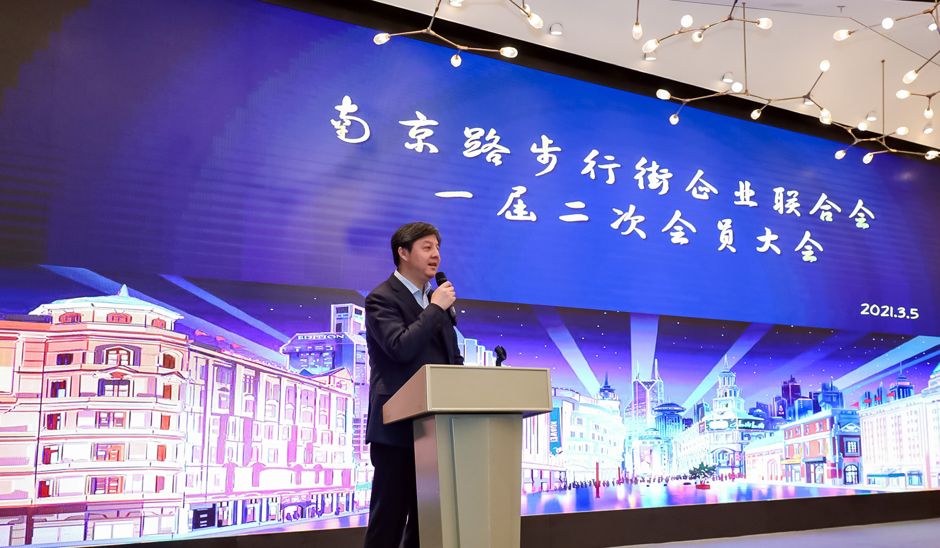 上海南京路步行街企业联合会会长陈湧在步行街企联会大会上发言。受访机构供图