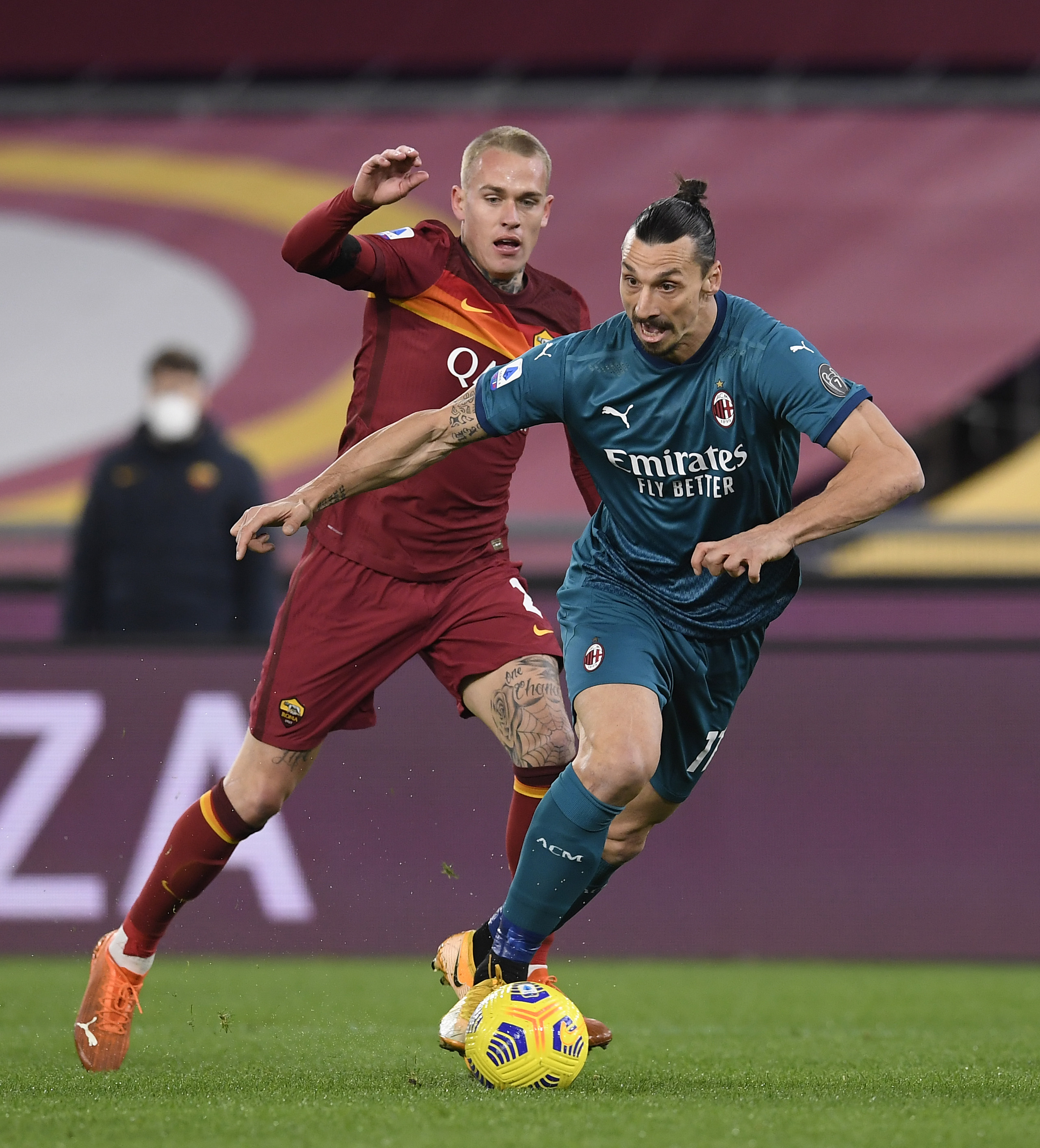2月28日,罗马队球员卡斯多普(左)防守AC米兰队球员伊布拉希莫维奇。新华社发(奥古斯托·卡萨索利 摄)