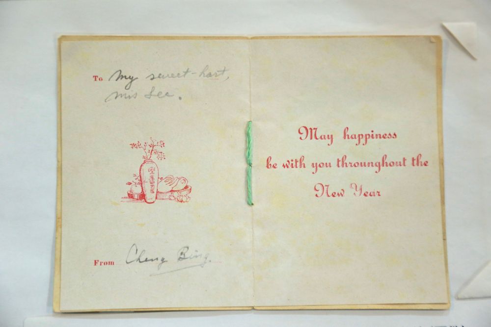 这张新年贺卡写于99年前,现收藏于井冈山革命博物馆,封面上是一名女话务员的头像,下方写着“恭贺新禧”四个金字,卡片中间用绿色毛线固定,内页写着字迹优美流畅的英文。