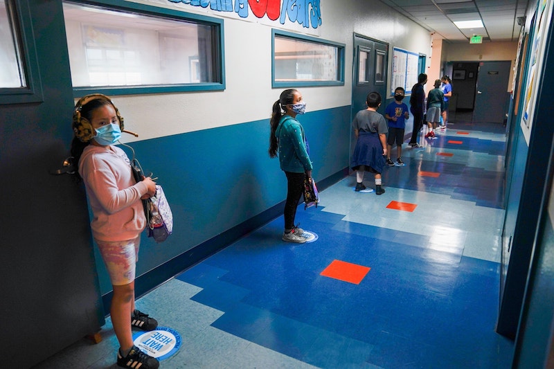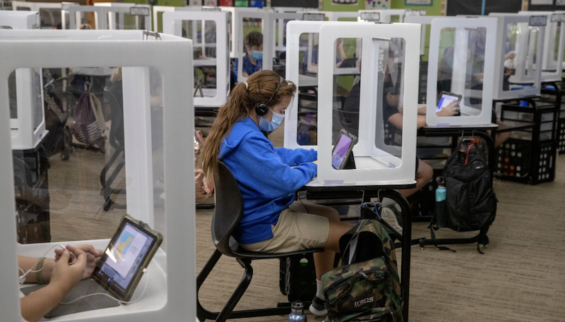 一些学校负责人称,教室的布局和班级的规模意味着不可能按6英尺间距的规定安排座位,因此学生之间只能用塑料隔板隔开。尽管学生和老师大多戴着口罩,但学生们不得不在教室里吃午餐,这让保持社交距离的防疫规定形同虚设。