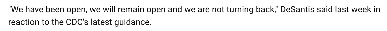 对于CDC发布的防疫指南,佛州州长表示“我们已经开放课堂,我们将坚持开放课堂,并且我们绝对不会回头。”而且佛州至今仍未发布强制口罩令或对公共场所聚集人数进行限制。
