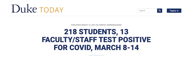 当地时间3月16日,美国杜克大学发表官方声明,3月8日至14日期间已有218名学生和13名教职人员新冠肺炎检测结果呈阳性。