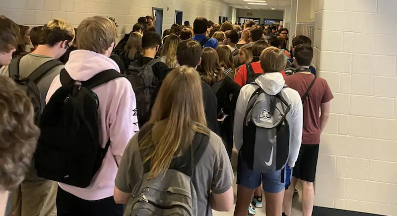 △佐治亚州一所高中走廊里几乎没有学生佩戴口罩