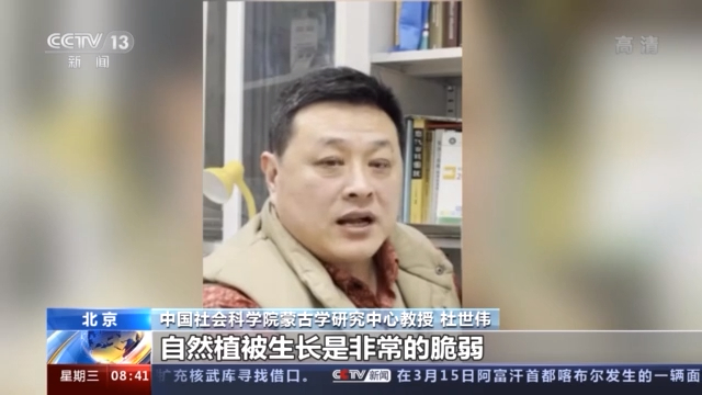 中国社会科学院蒙古学研究中心教授 杜世伟:现在全球气候变化异常天气非常频繁。自从工业化以来,碳排放量、温室效应非常强,对自然气候,特别是自然的植被生长影响非常大,特别是高原地带,植物分布比较脆弱的地区,特别是戈壁地区的影响更多。