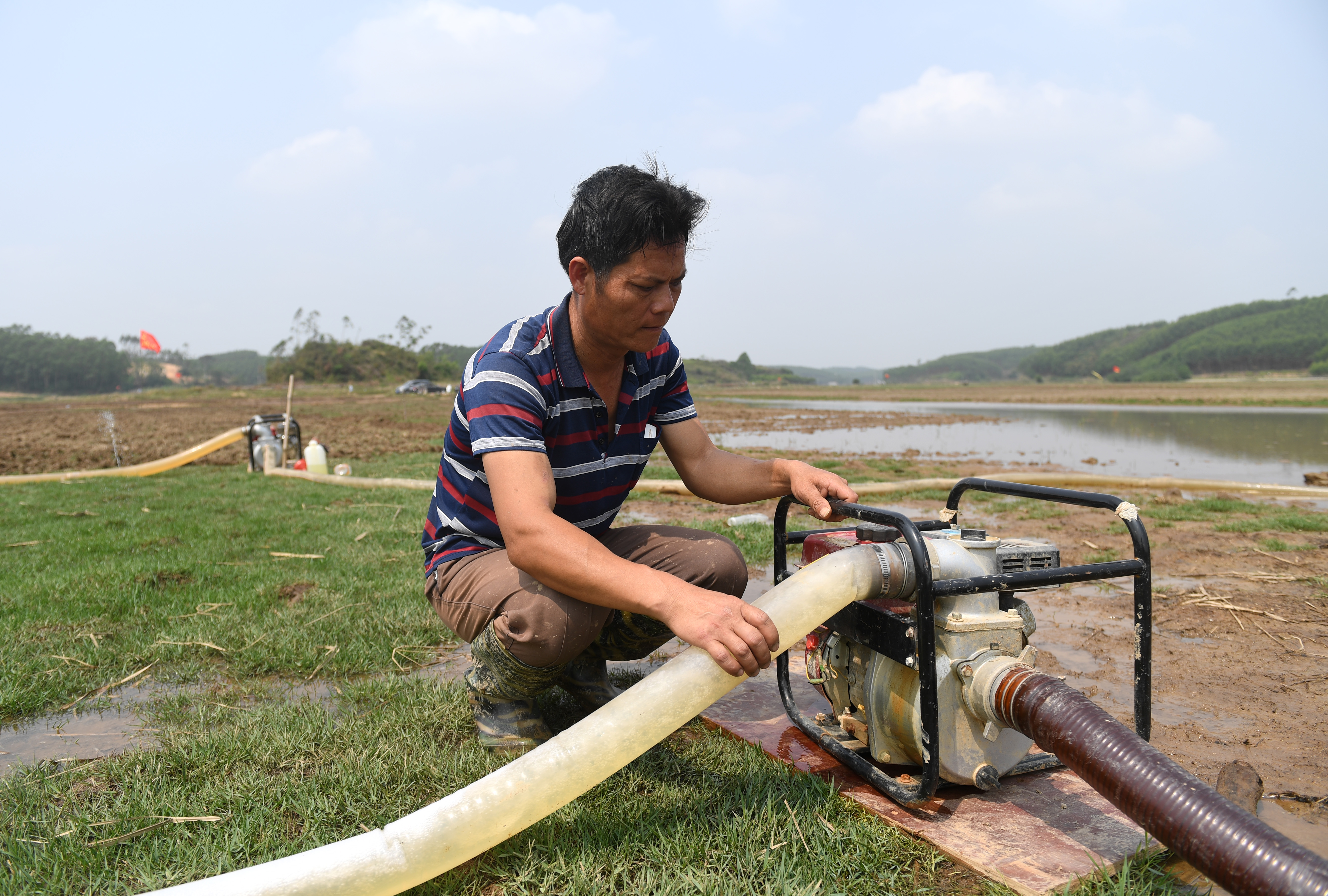 在广西钦州市钦南区东场镇上寮村,村民黄文月在查看抽水机情况。新华社记者陆波岸摄