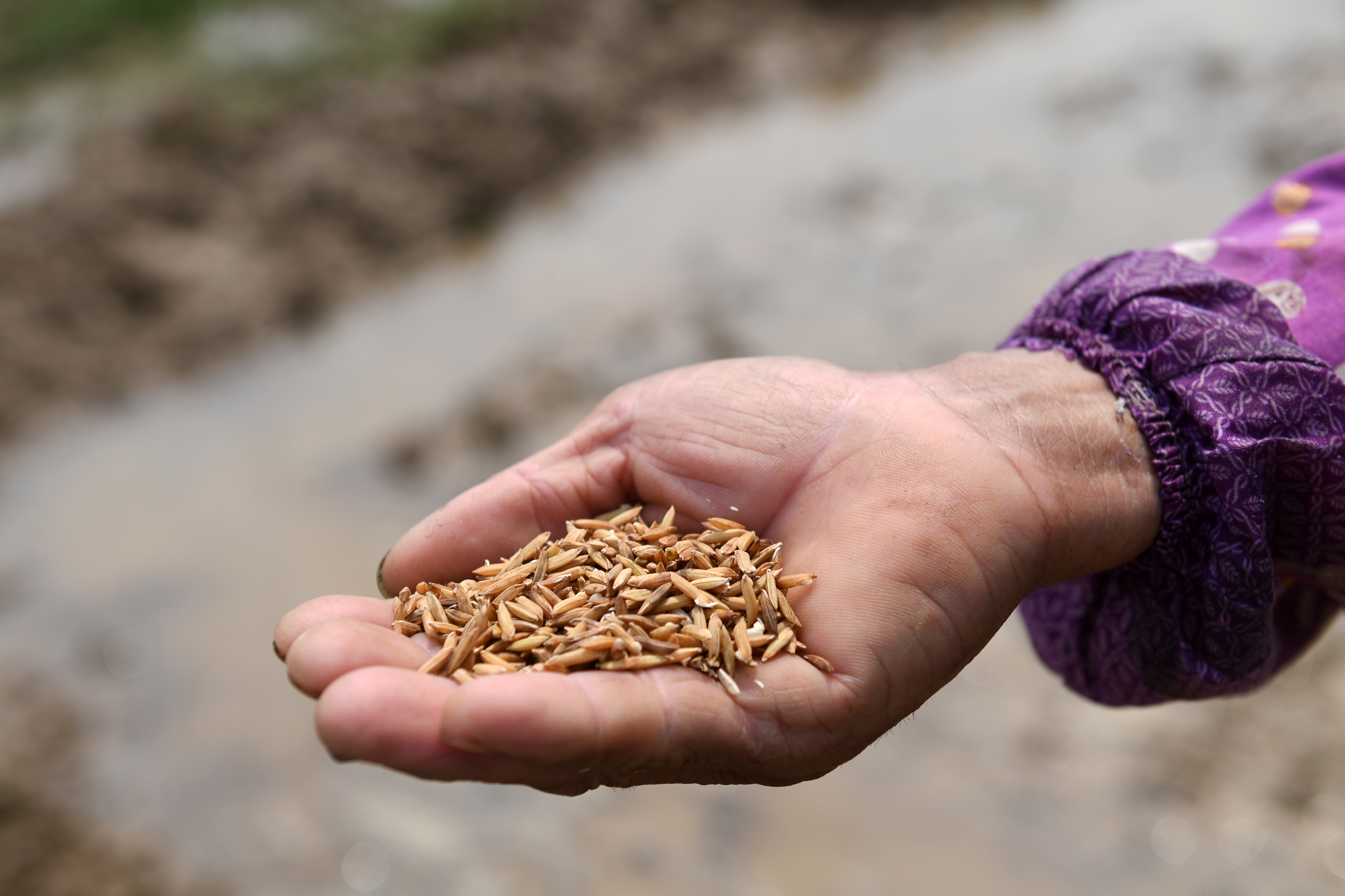 在广西钦州市钦南区东场镇上寮村,村民在展示春耕用的种子。新华社记者陆波岸摄