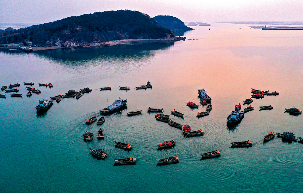 3月9日,山东荣成俚岛湾,渔民们驾船在码头集结,准备前往藻类养殖区进行作业 李信君摄/本刊
