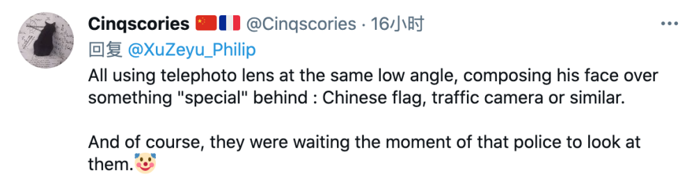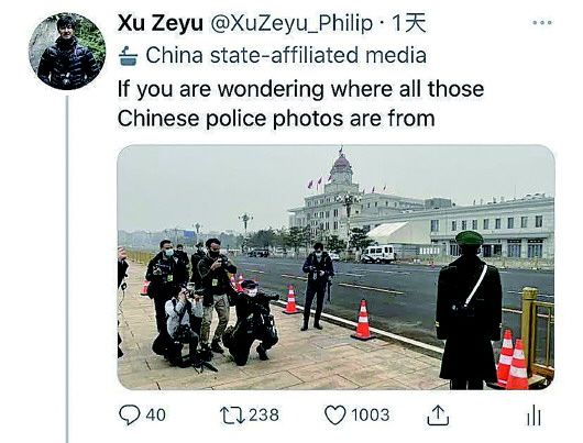 ↑徐泽宇将抓拍到的外媒记者拍摄武警照片上传到自己的推特账号。