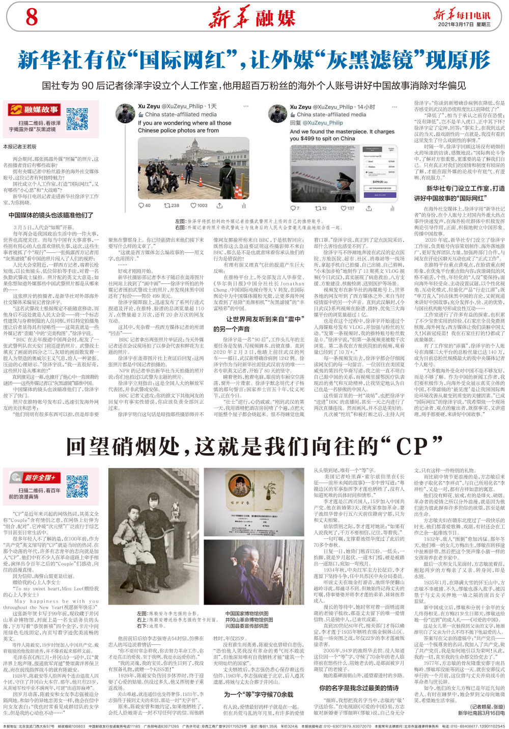 在海外社交媒体上,徐泽宇用“新华社记者”的身份,在个人账号上对国内外重大热点事件快速发声,在海外粉丝群体中积极发挥舆论引导作用,正面、积极地树立中国形象、传播中国故事。