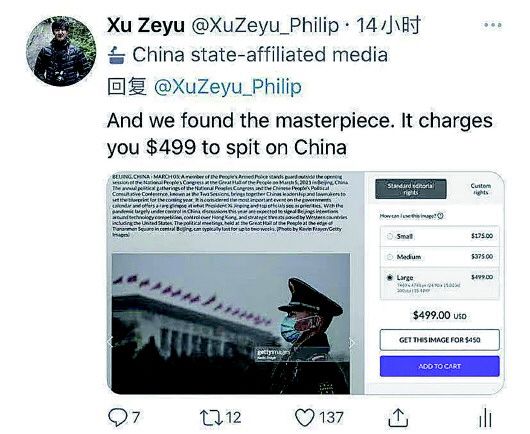 新华社摄影部记者李木子随后在盖蒂图片社网站上找到了“画中画”——徐泽宇所拍的外媒记者围拍武警战士的照片,并发现抹黑中国还有了标价——售价499美元。