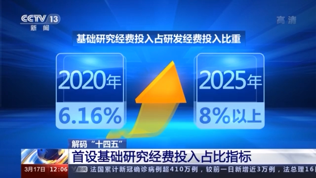 “十四五”时期,基础研究被放到更加重要的位置。制定实施基础研究十年行动方案,重点布局一批基础学科的研究中心,还首次针对基础研究经费投入的情况设置指标。到2025年,我国基础研究经费投入占研发经费投入比重要提高到8%以上,持之以恒加强基础研究,化为规划纲要中实实在在的行动。