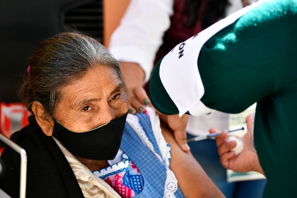 3月9日,墨西哥伊达尔戈州阿卡克索奇特兰的居民在一处新冠疫苗接种点接种疫苗。墨西哥伊达尔戈州小城阿卡克索奇特兰9日开始接种中国科兴新冠疫苗,当地首批接种人群为60岁及以上的老年人。(新华社记者辛悦卫摄)