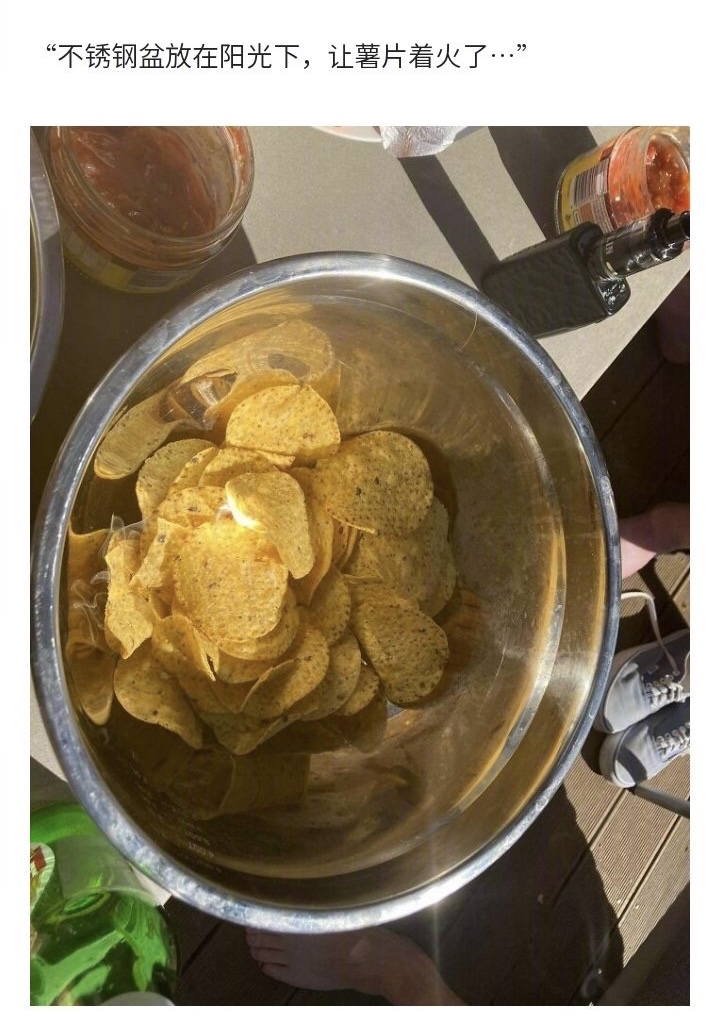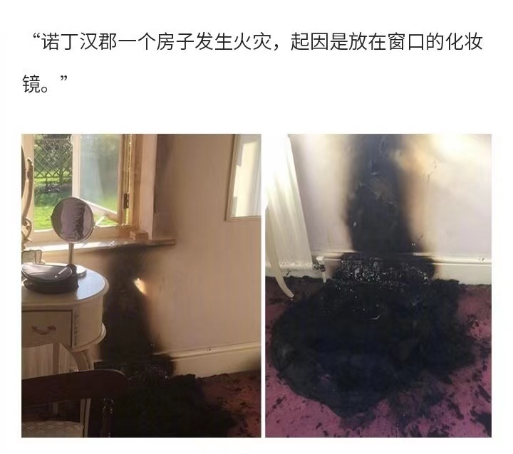 日本网友放在窗边的一面标准化妆镜(放大那一面)反射了阳光,照在沙发上引发了一场镜面聚焦型火灾。