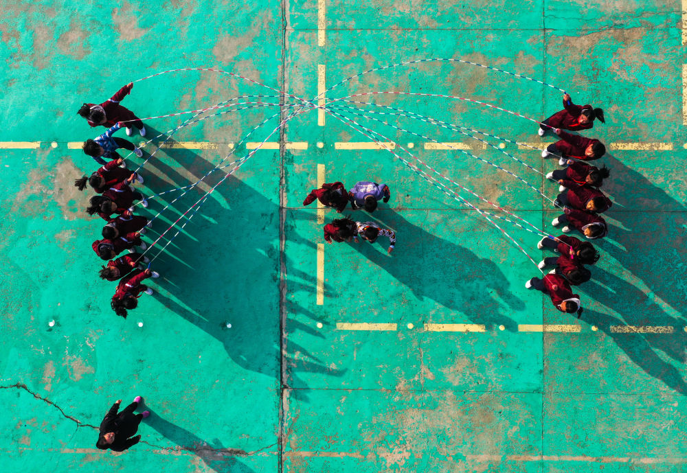 一根细细的跳绳 在孩子们的手中就像被施了魔法 跳出了变幻莫测的花样