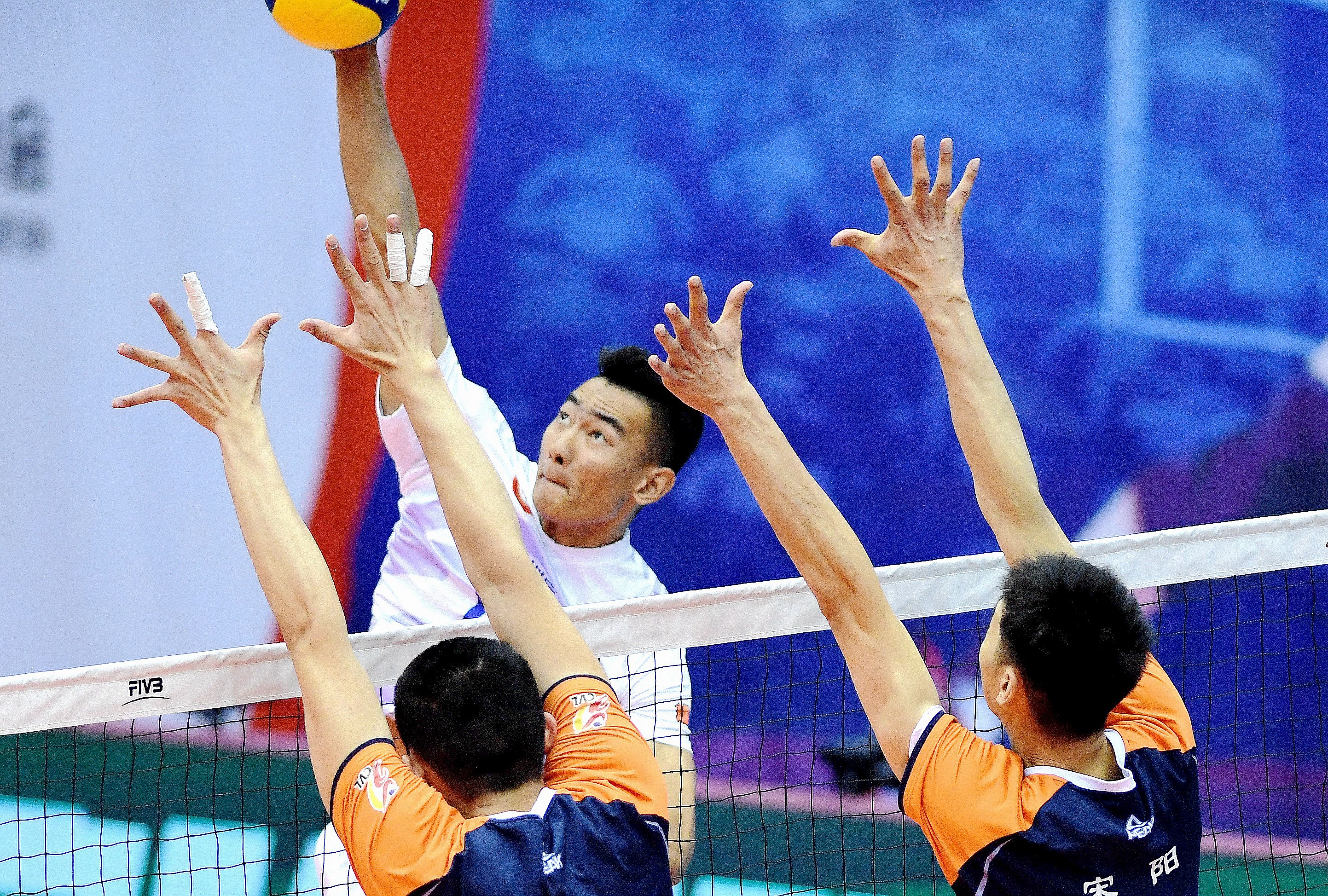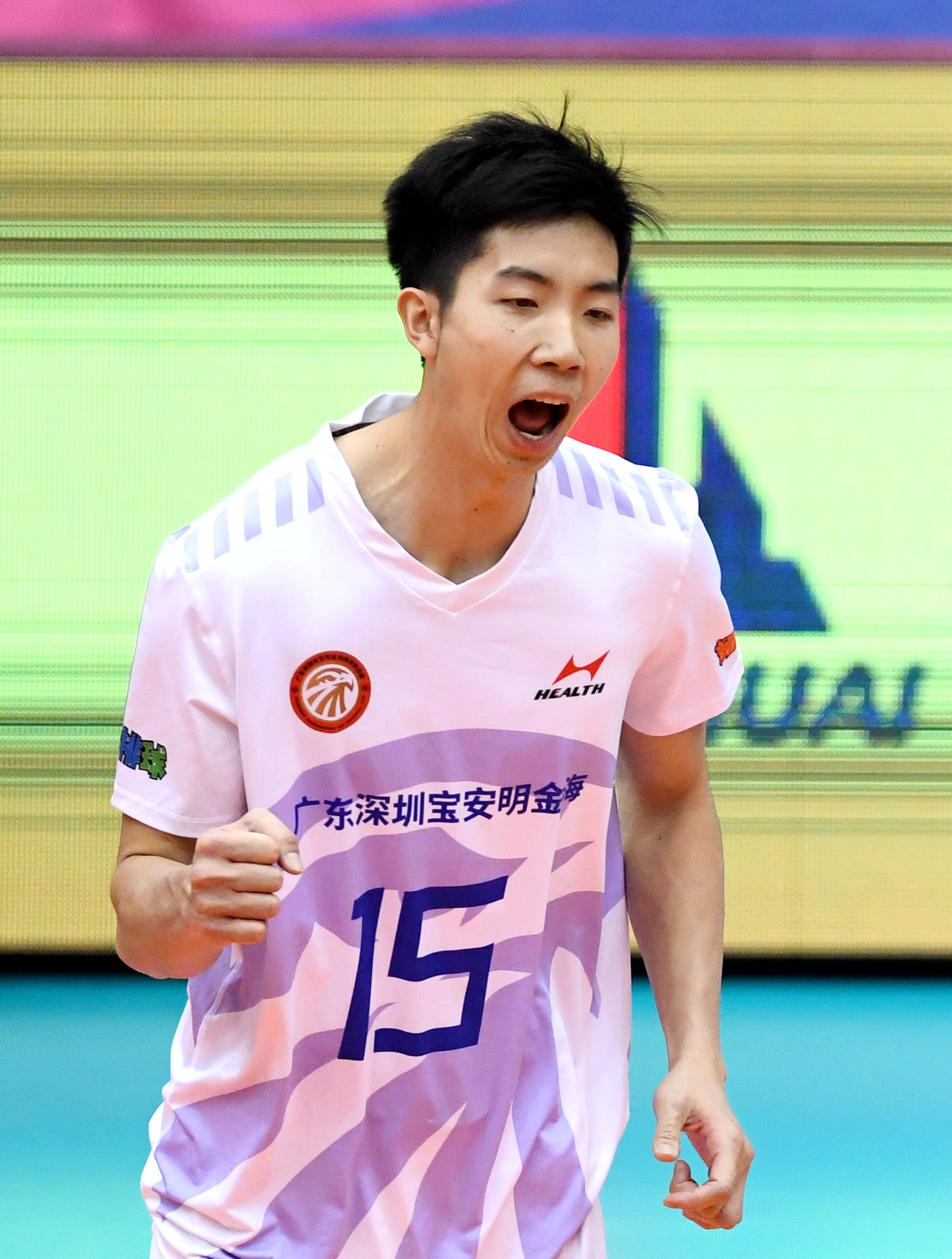 ↑广东深圳宝安明金海队球员林嘉熙(中)在比赛中扣球。