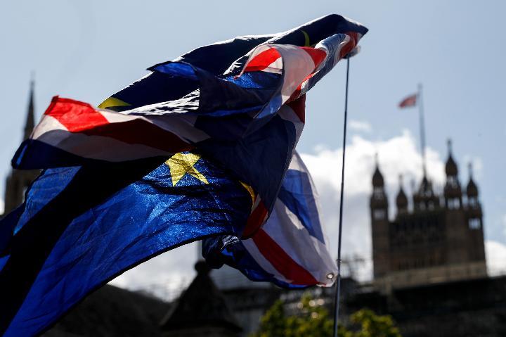 这是2019年9月4日在英国伦敦议会大厦外拍摄的英国国旗和欧盟旗帜。(新华社记者韩岩摄)