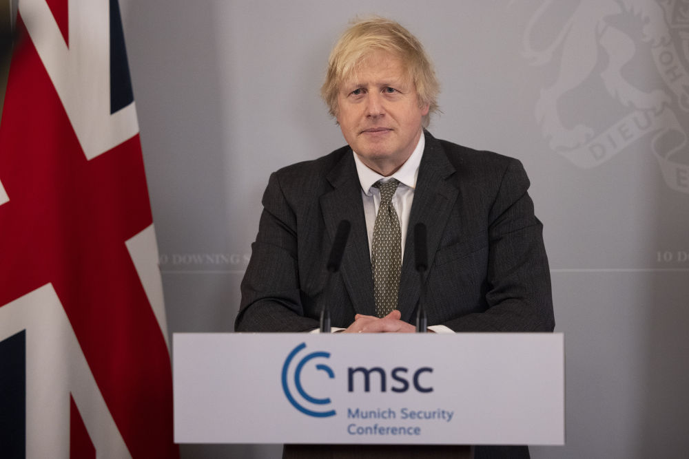 2月19日,在英国伦敦,英国首相约翰逊通过视频出席慕尼黑安全会议线上特别会议。(新华社发,英国首相府供图)