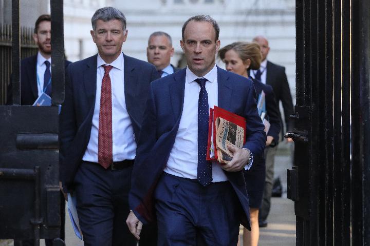 2020年3月25日,在英国伦敦,英国外交大臣拉布抵达首相府。(新华社发,蒂姆·爱尔兰摄)