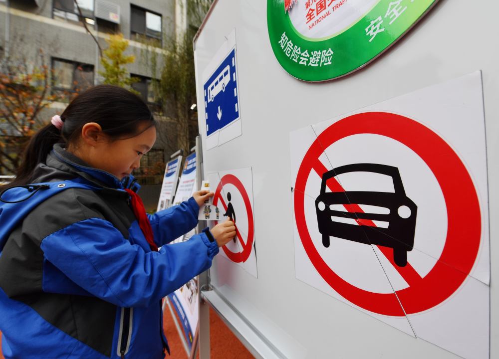 2020年11月20日,西安市实验小学的学生在校园内学习交通安全知识。