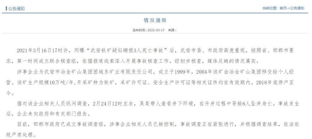据武安市人民政府网站17日消息,2021年3月16日17时许,网曝“武安铁矿疑似瞒报3人死亡事故”后,武安市委、市政府高度重视,按照省、邯郸市要求,第一时间成立联合核查组,依据报道线索深入开展事故核查工作。经初步核查,媒体反映的情况属实。