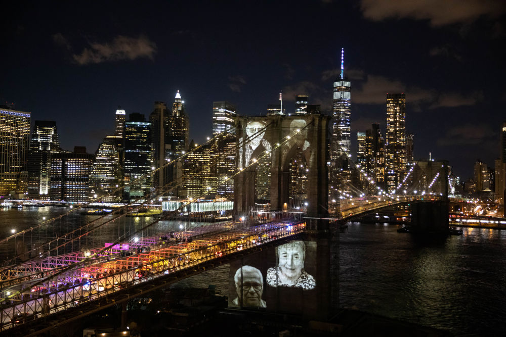 2021年3月14日,新冠逝者的照片在纪念活动上被投射到美国纽约布鲁克林大桥上。当天,美国纽约市举行纪念活动,悼念该市超过3万名新冠逝者。(新华社发,郭克摄)