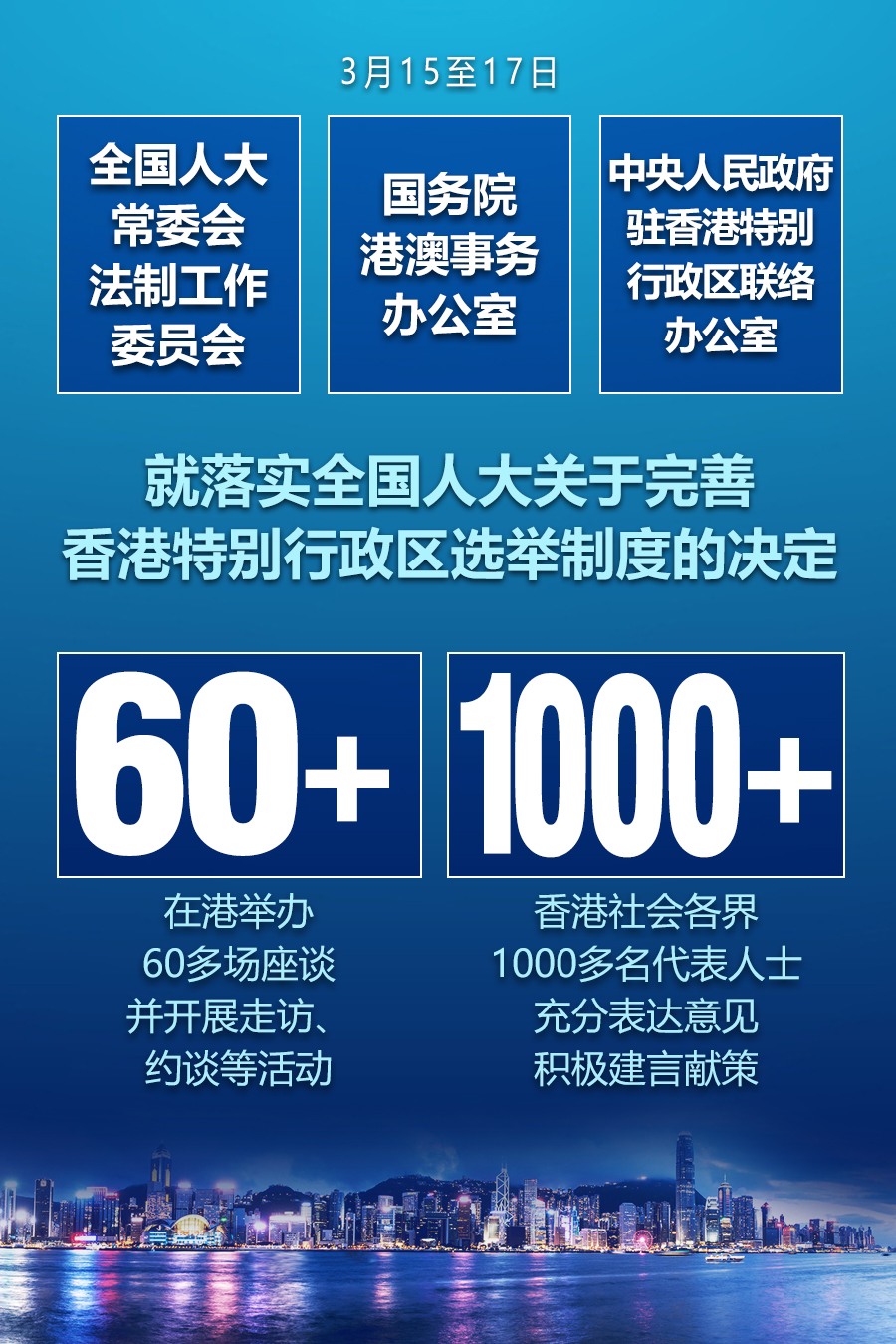连日来,全国人大常委会法制工作委员会会同国务院港澳事务办公室、中央人民政府驻香港特别行政区联络办公室就落实全国人大关于完善香港特别行政区选举制度的决定,在港举办60多场座谈并开展走访、约谈等活动。来自香港政界、工商界、金融界、专业界、劳工界、宗教界、妇女界、青年界、地区、基层的代表人士以及智库代表等1000多人,围绕如何完善选举制度,充分表达意见,积极建言献策。