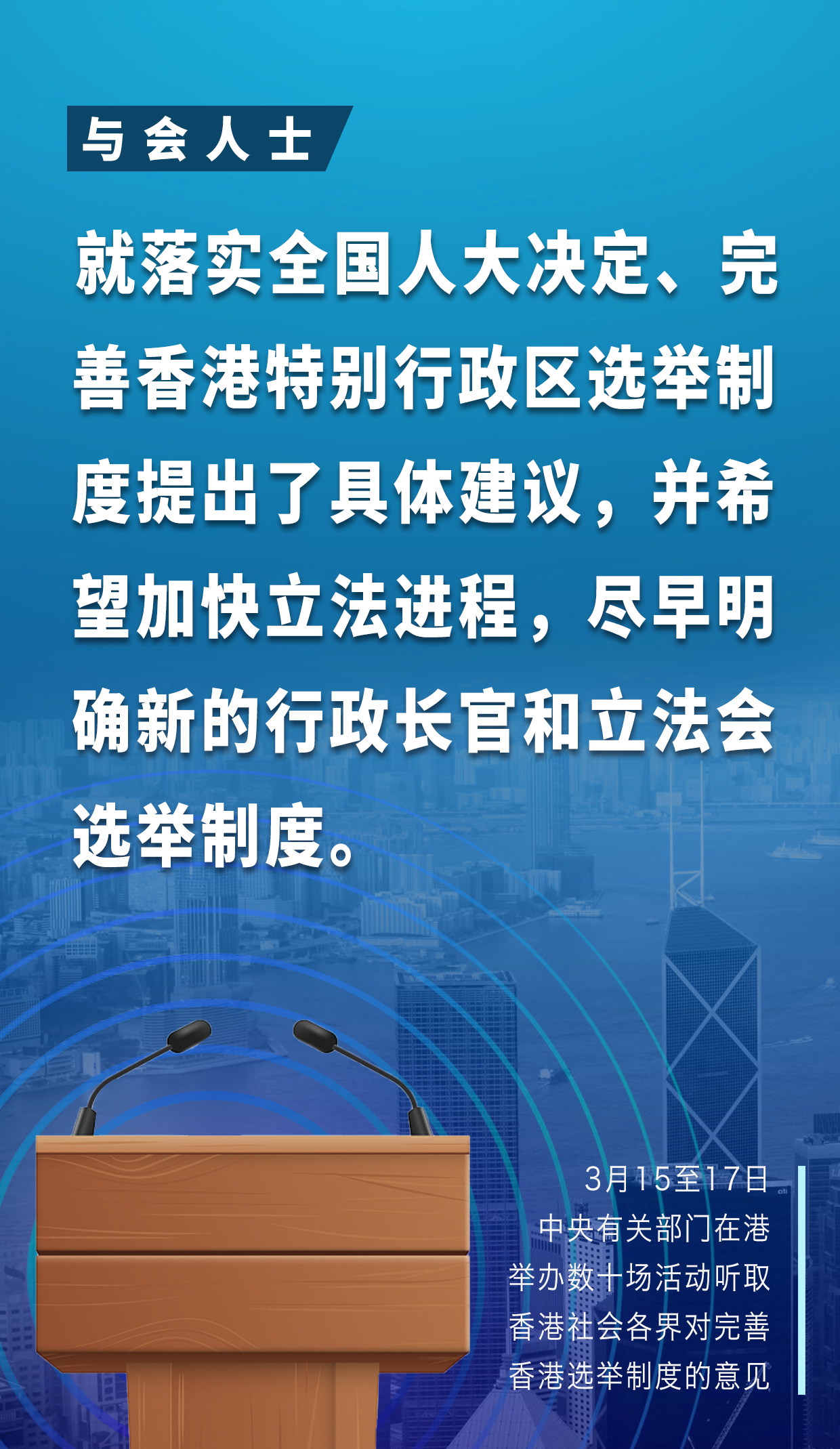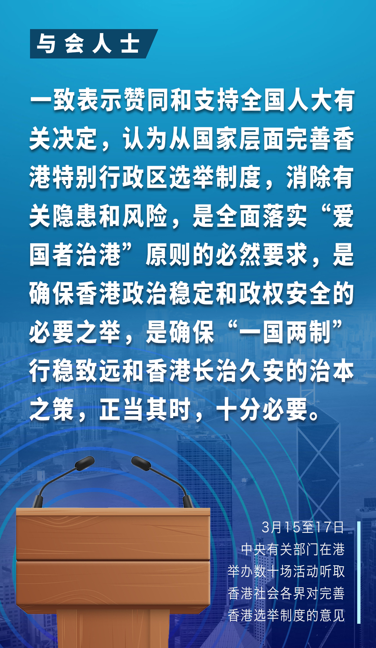 3月15日至17日的多场座谈会上,香港各界代表人士踊跃发言,聚焦重点、发表真知灼见;会场之外,众多香港市民自发前往街站或通过网上联署,签名支持全国人大关于完善香港特别行政区选举制度的决定。人们相信,完善香港选举制度是维护香港特别行政区政治稳定和政权安全的治本之策,有利于及时巩固、提升香港国安法实施后香港社会由乱及治的局面,对香港长治久安、“一国两制”行稳致远意义重大。