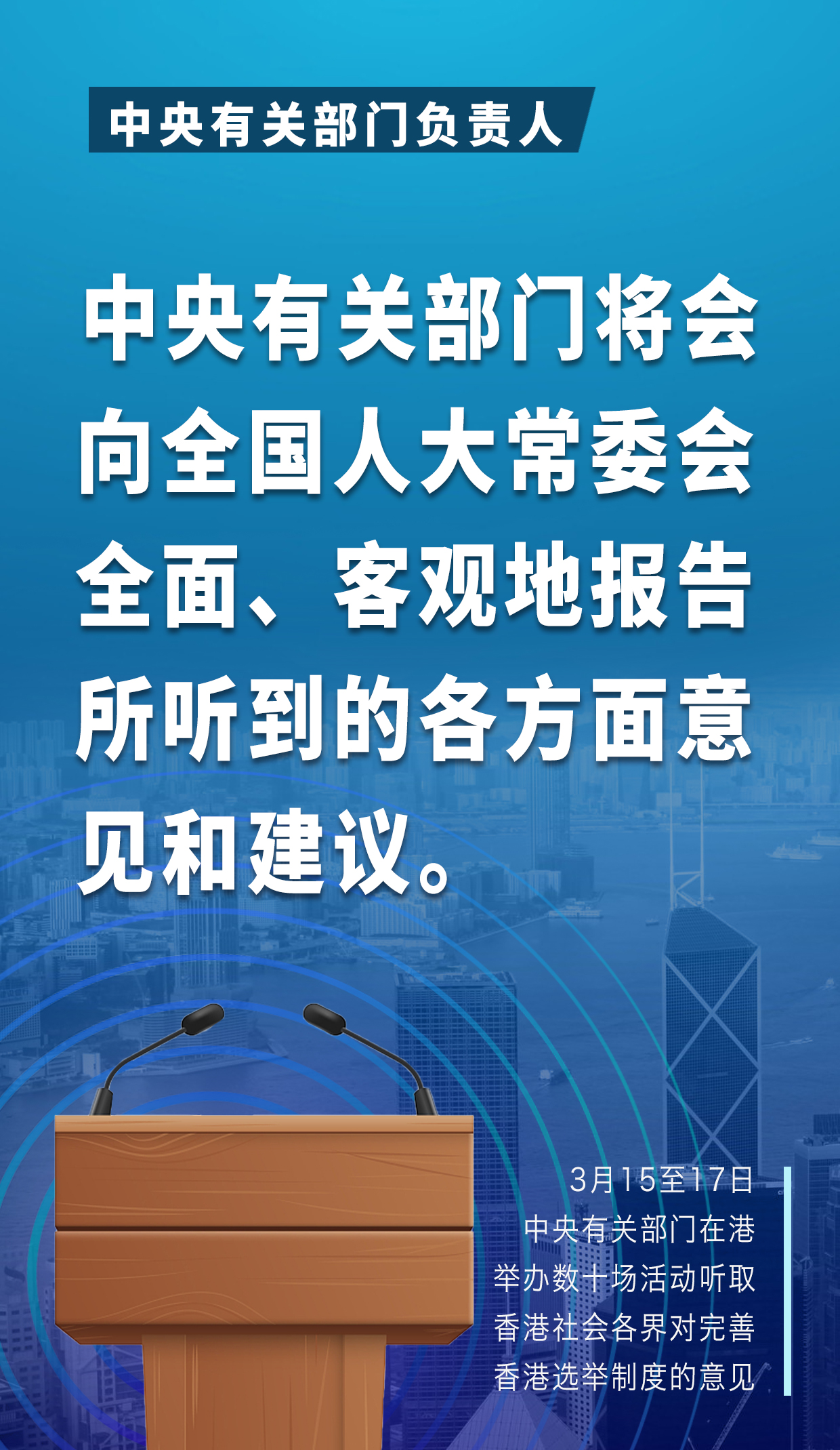 2月28日至3月1日,中央有关部门在深圳市召开座谈会,广泛、充分听取香港社会各界代表人士对完善“爱国者治港”有关制度的意见。全国两会期间,相关部门又以多种方式,逐一听取了港区全国人大代表、政协委员的意见。