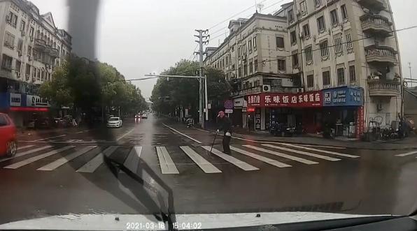 当时,一位步履蹒跚的老人正拄着拐杖过马路,天空正下着雨,老人由于腿脚不便,迟迟没有通过。