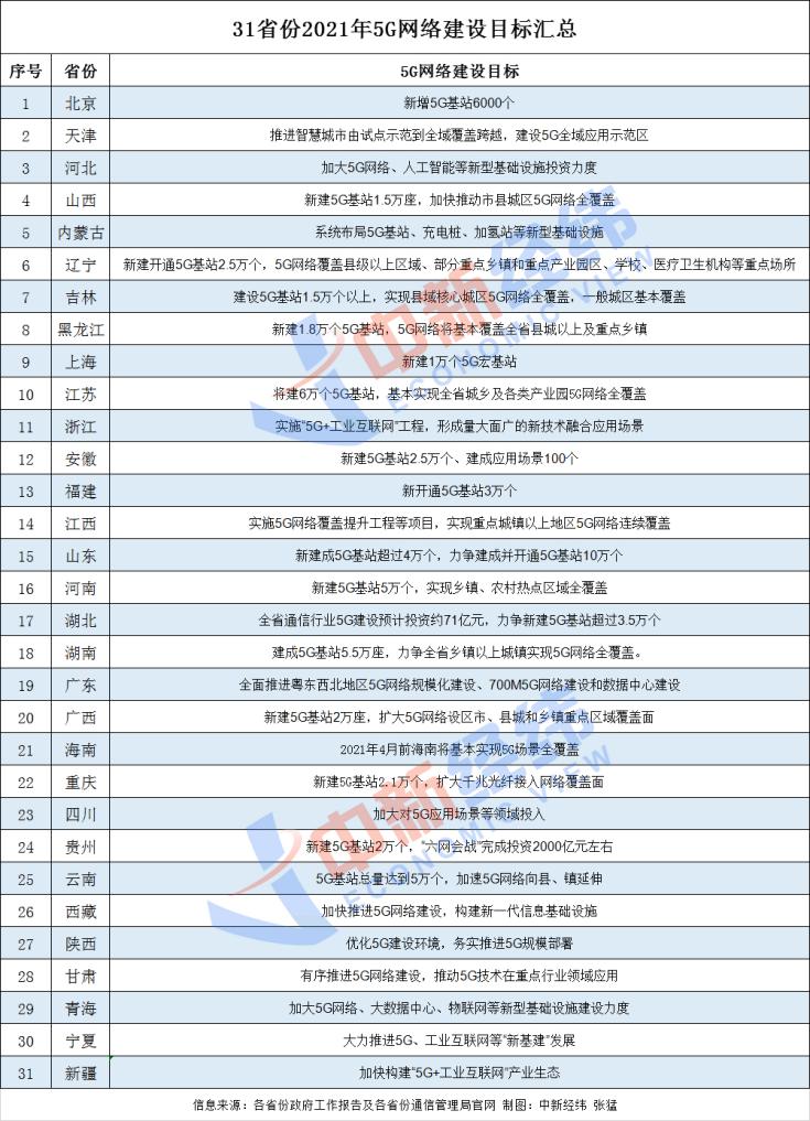 中新经纬记者梳理发现,31省份均已发布2021年5G网络建设目标,其中多省份明确基站建设数量,从几千个至几万个不等。