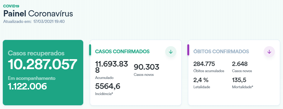 截至当地时间3月17日,据巴西卫生部发布的数据,巴西新冠肺炎确诊病例累计11693838例,单日新增确诊病例90303例,死亡病例累计284775例,单日新增死亡病例2648例,累计治愈10287057例。