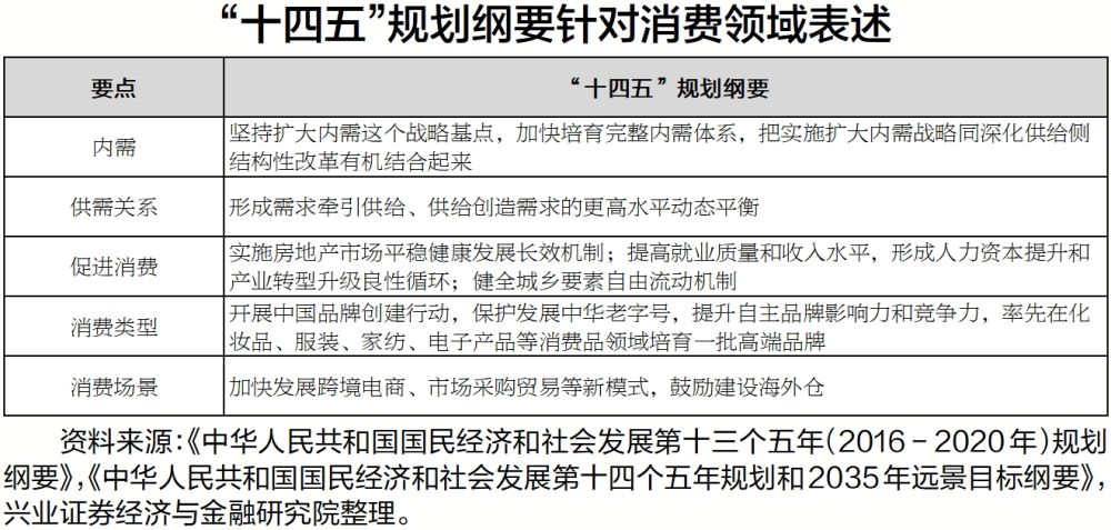 “‘十四五’规划纲要对促进内需的重视程度较‘十三五’大幅提高,首次对内需单独成篇。”兴证策略王德伦团队强调指出,“十四五”规划纲要提出“供需更高水平动态平衡”“加快培育完整内需体系”“全面促进消费”等主要纲领,并在多个消费场景提出具体措施,并在传统场景之外增添了互联网线上、海外仓等新型消费领域。