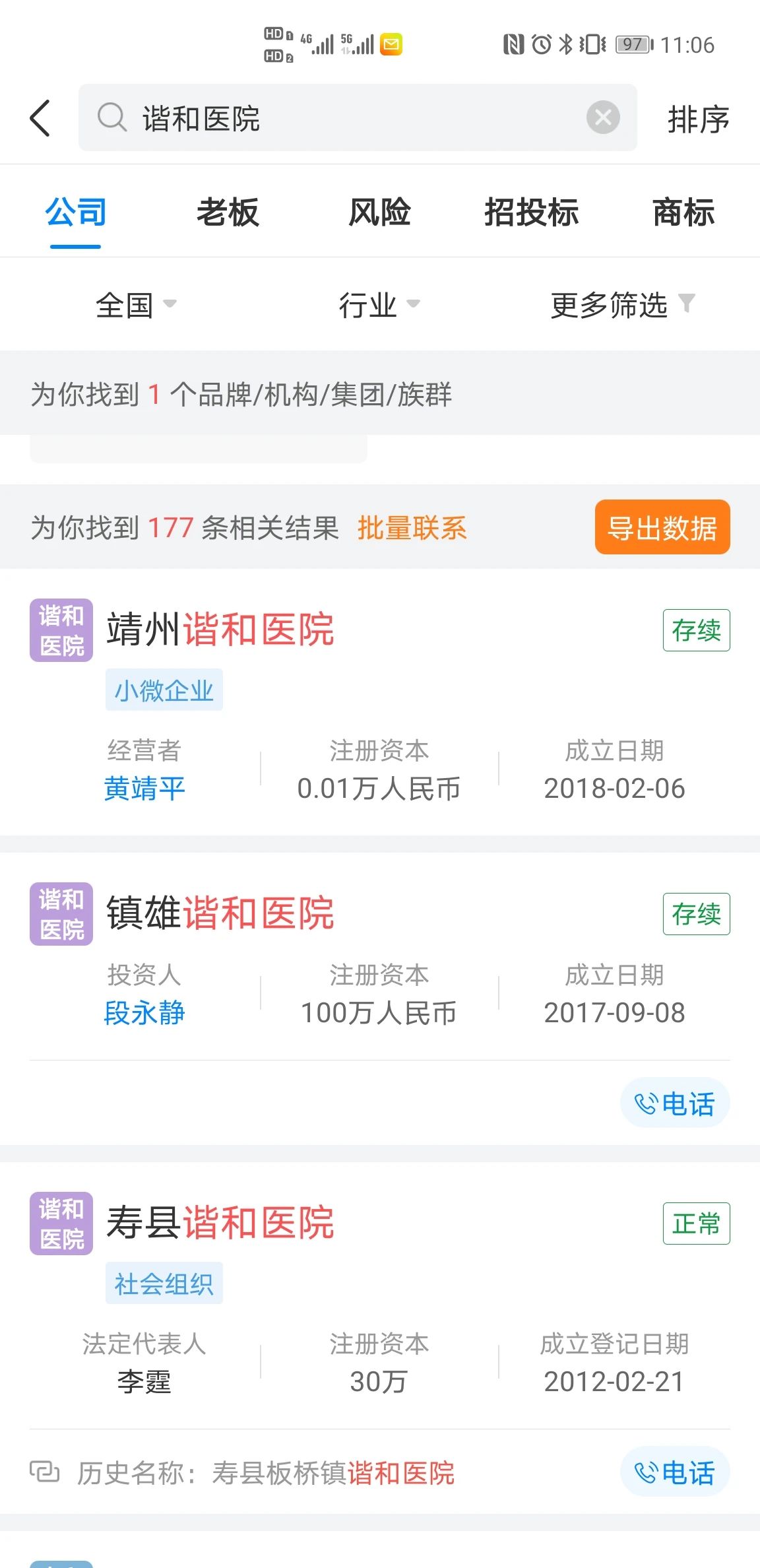 在天眼查上搜索到的“谐和”字号相关的医疗机构有上百家。(网页截图)