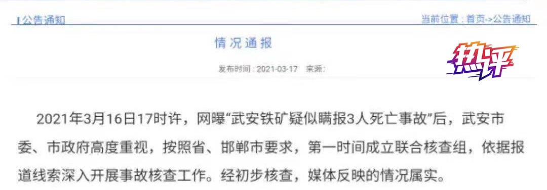 又见瞒报!从通报呈现的信息可知,武安铁矿坠井事件遇难6人,而非3人;事件发生在2月24日,距今已经20多天,才终获证实。“企业未向政府和有关部门报告”,涉事矿长胆子够大。