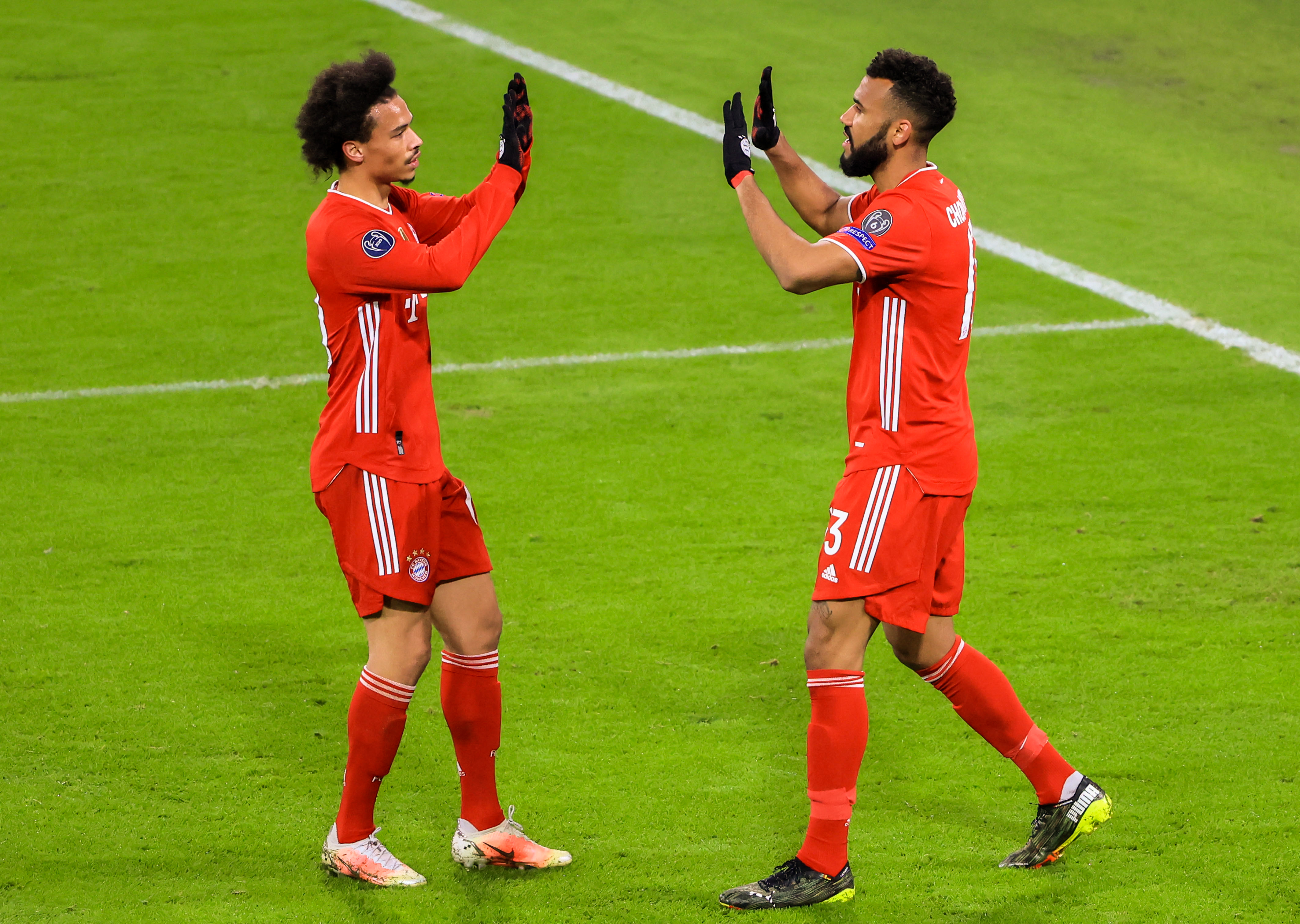 图为3月17日,拜仁慕尼黑队球员舒波-莫廷(右)在比赛中进球后与萨内庆祝。新华社发(菲利普·鲁伊兹摄)