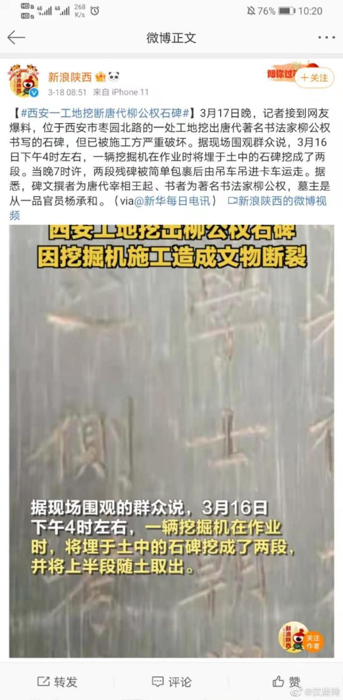 陕西省文物局官方微博3月18日发布关于枣园北路项目出土的唐杨承和神道碑情况。